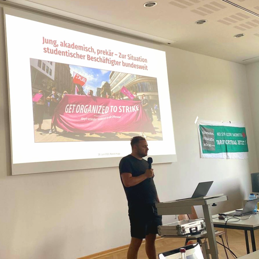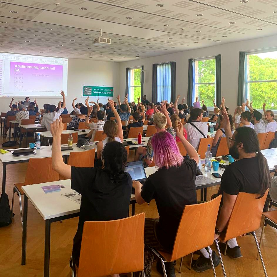 An der Vollversammlung nahmen rund 100 Studentische Beschäftigte aus mindestens 10 verschiedenen Fachbereichen, sowie aus Bibliotheken und der Verwaltung der Goethe-Uni teil. Es war damit die größte Versammlung Studentischer Beschäftigter an der Goethe-Uni seit mindestens 10 Jahren und bundesweit die größte für die kommende Tarifrunde. Als Teil einer mittlerweile bundesweiten Bewegung TVStud in über 40 Ortsgruppen, organisieren sie sich für die flächendeckende Durchsetzung eines Tarifvertrags für Studentische Beschäftigte an Hochschulen in Deutschland. Dass die Beschäftigungsbedingungen Studentischer Hilfs-kräfte und Tutor*innen strukturell desolat sind und grundlegende Arbeitsrechte missachtet wer-den, zeigt nicht zuletzt die großangelegte Studie «Jung, akademisch, prekär. Studie zu sozialer Lage und Arbeitsbedingungen Studentischer Beschäftigter an Hochschulen und Forschungseinrichtung» (Hopp et al. 2023) [1].