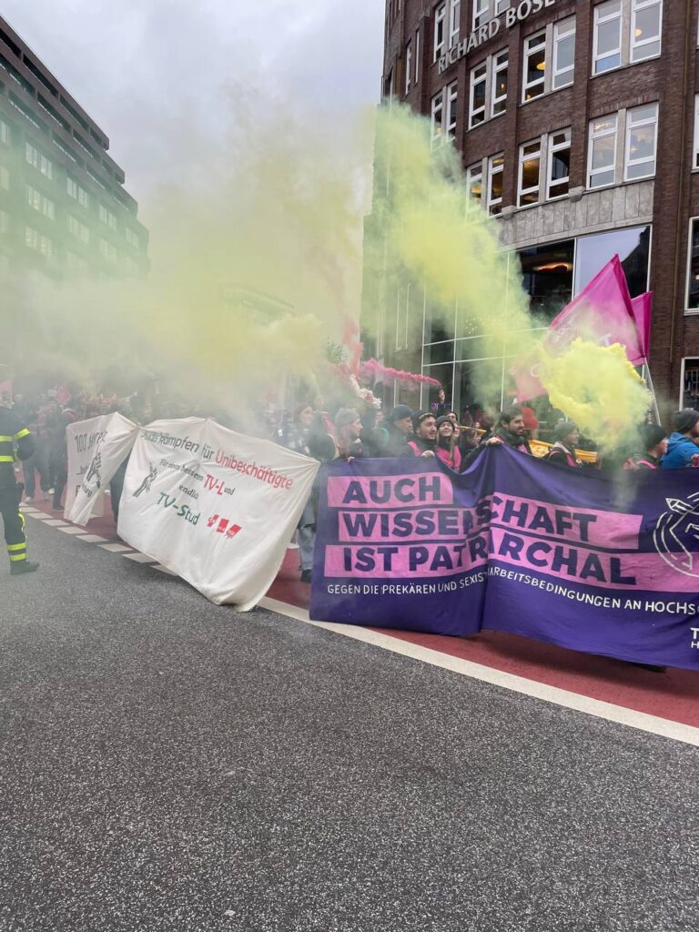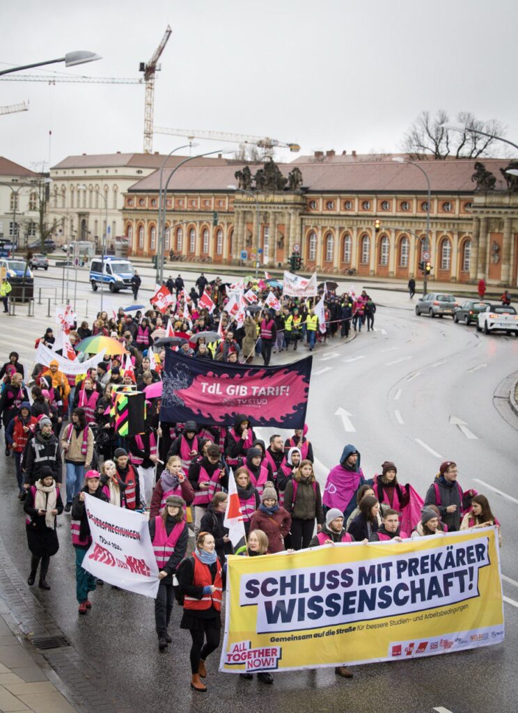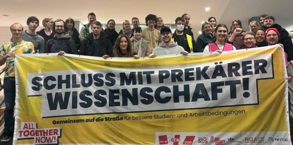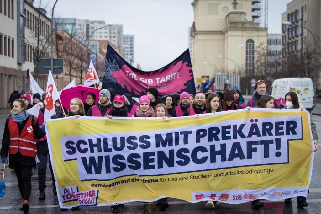 Let’s stand up and take to the streets united: All together now! Whether taking action on campus, (supporting) staff going on strike or collecting signatures for the petition #StopptDauerbefristung (End serial fixed-term contracts) [find the digital version here: http://weact.campact.de/petitions/stoppt-die-dauerbefristung-in-der-wissenschaft].