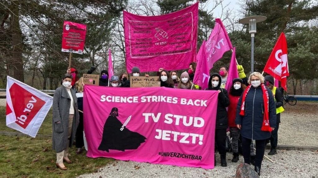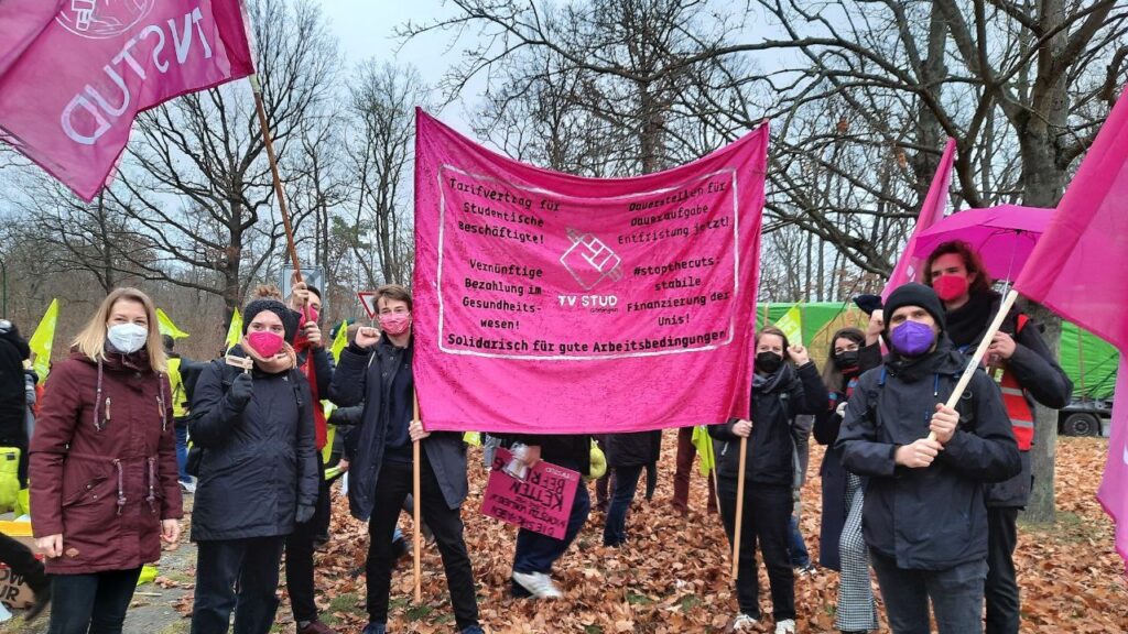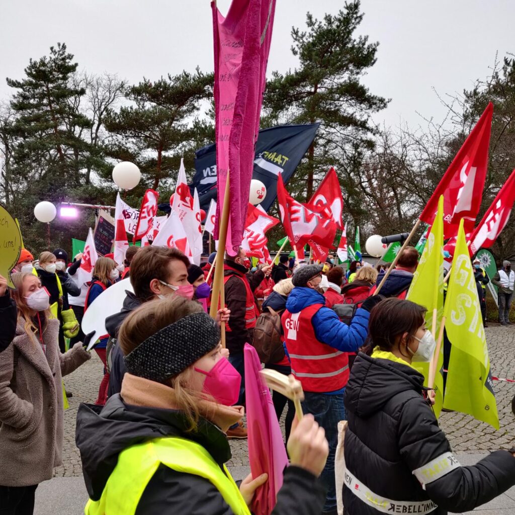 TVStud-Aktive mit Sylvia Bühler (ver.di) und Maike Finnern (GEW) bei der dritten Verhandlungsrunde in Potsdam (27.11.2021)
